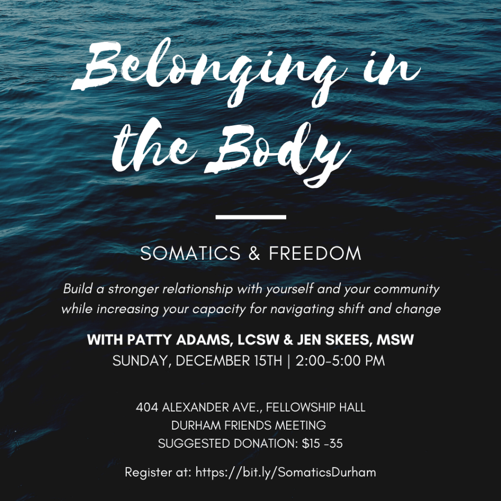 Open to all. No movement/yoga experience needed. By Donation. Proceeds will go to support local People of Color-led racial and economic work, and to Triangle SURJ, which has a Resource Steward Team, a mixed-class team making decisions about how to manage the resources that flow in to and out of TSURJ in accordance with values and relationships of accountability. Details of the disbursement of proceeds will be published on this event page following the event. A small portion will go to the lead trainer to support her livelihood.