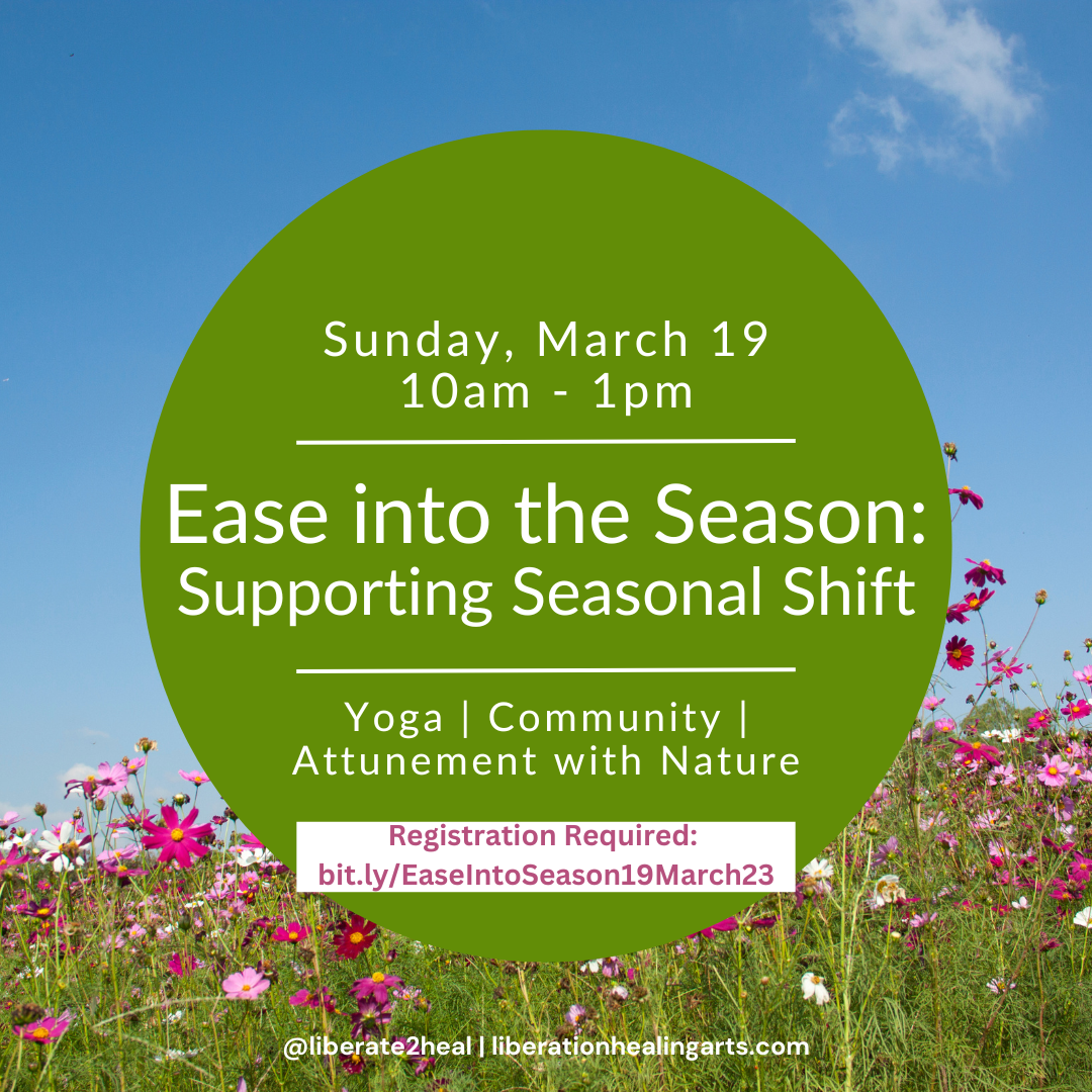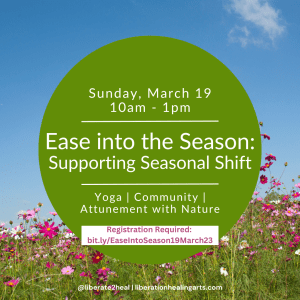 The changing seasons provide an important invitation to reset, recenter, and resource ourselves. On the cusp of the Spring Equinox, join Patty Adams for an outdoor offering combining yoga, community building, and an exploration of how to attune with the seasonal shifts to navigate change with more ease. Includes herbal support tea. Registration required.